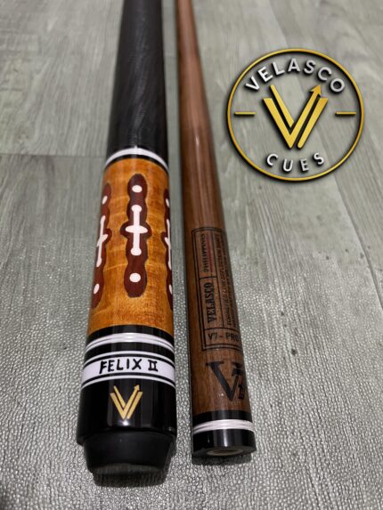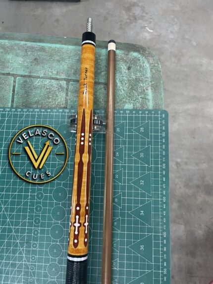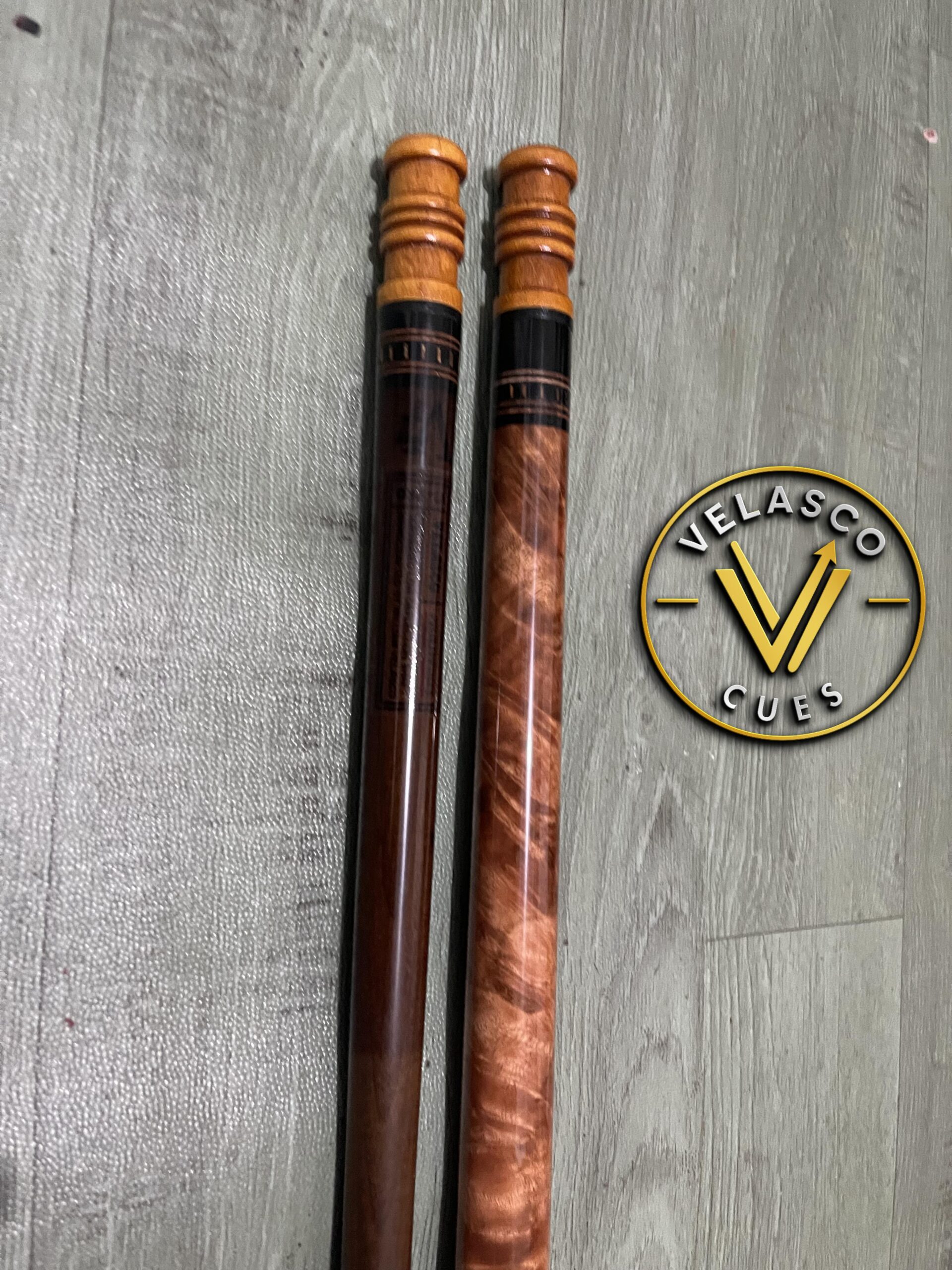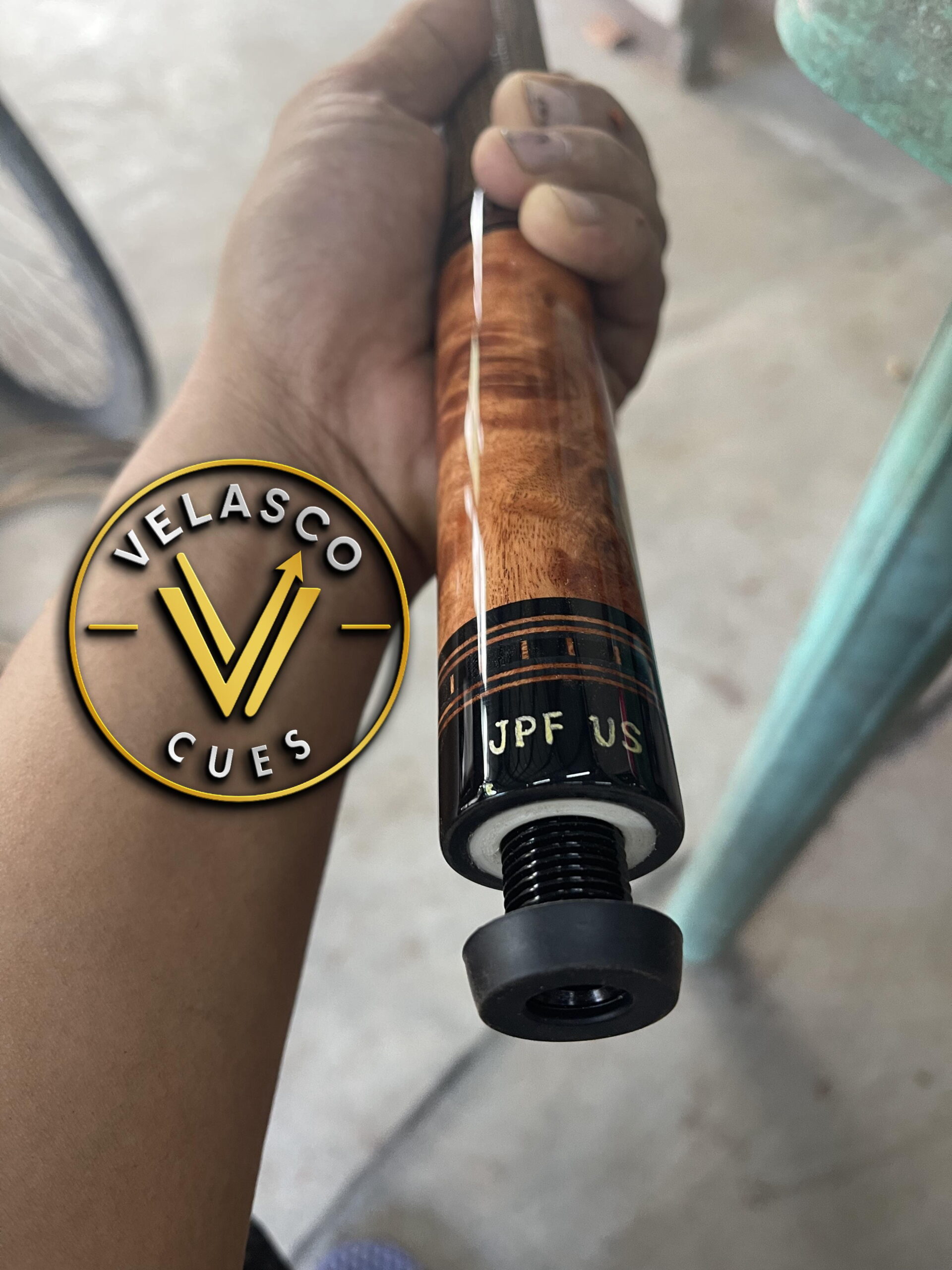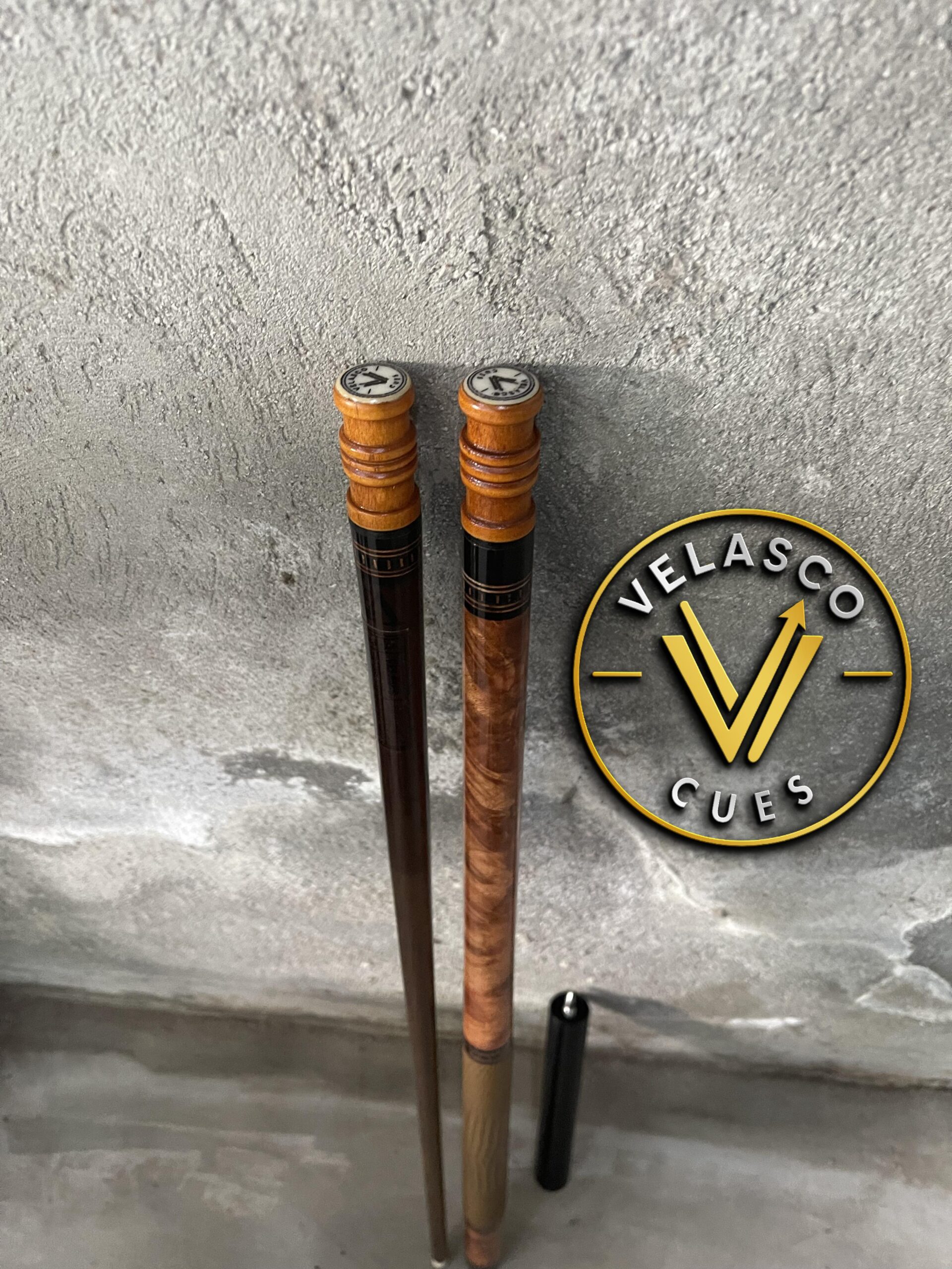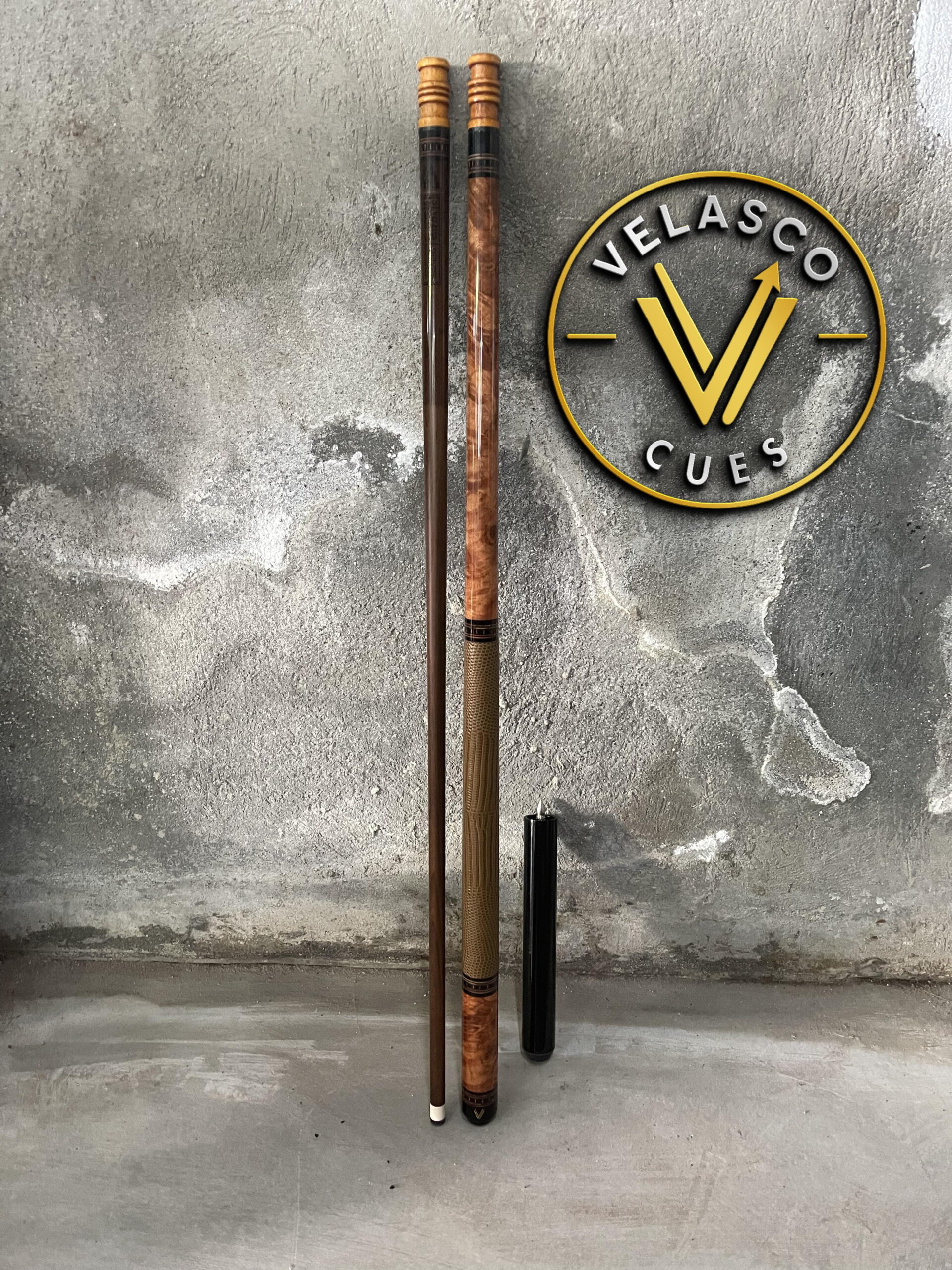 A custom pool cue made with a natural burl wood butt sleeve and forearm, featuring