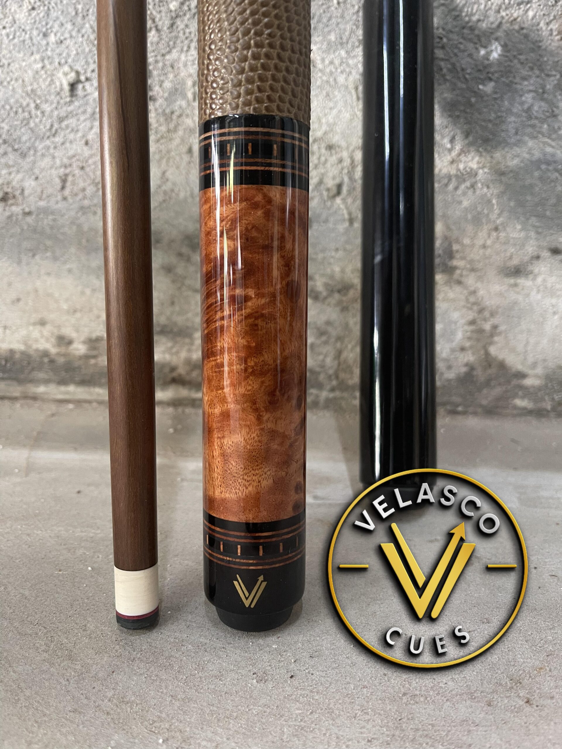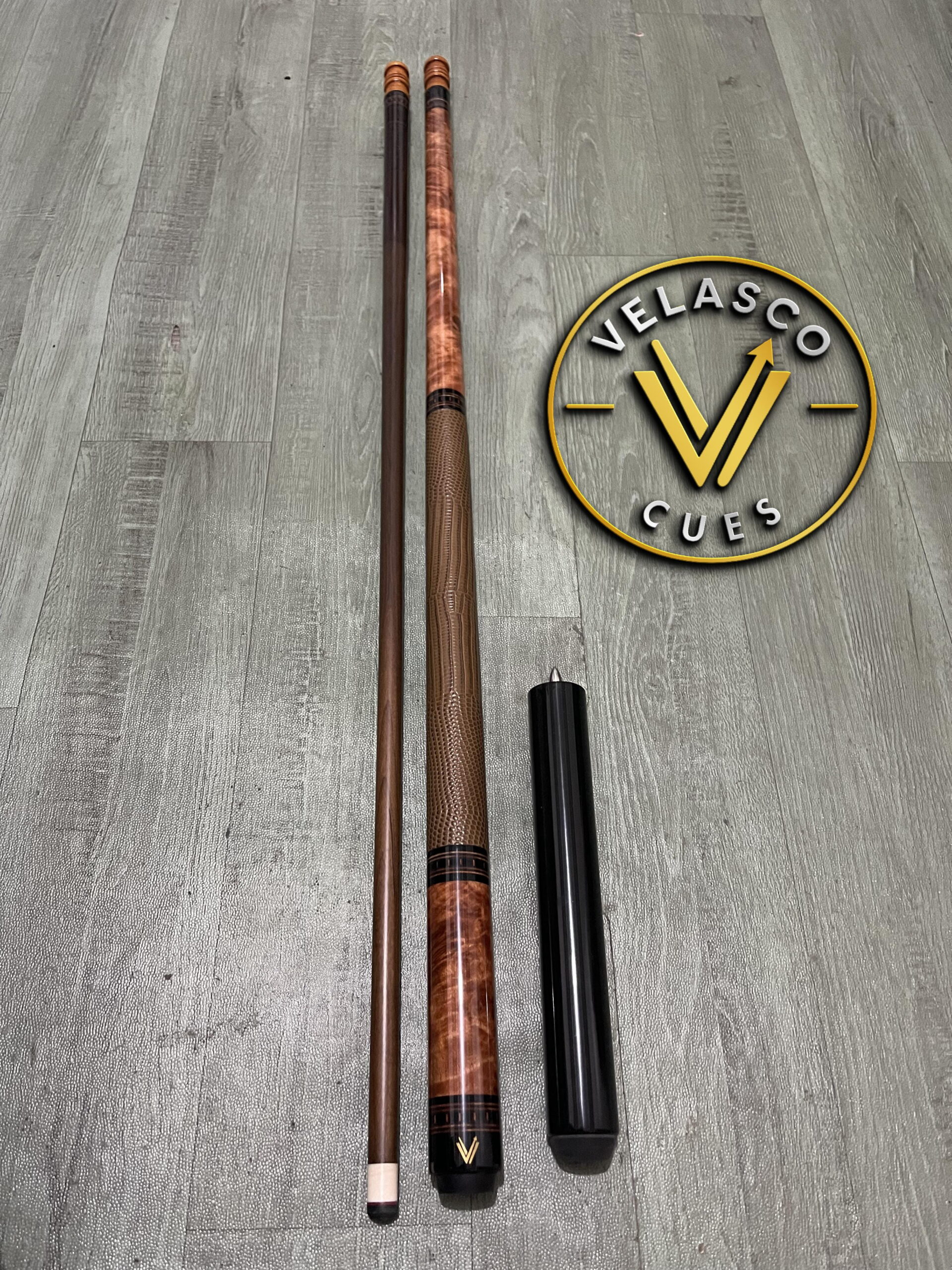 black accents and a brown-colored textured wrap, lizard-pattern leather. The cue has a clean,