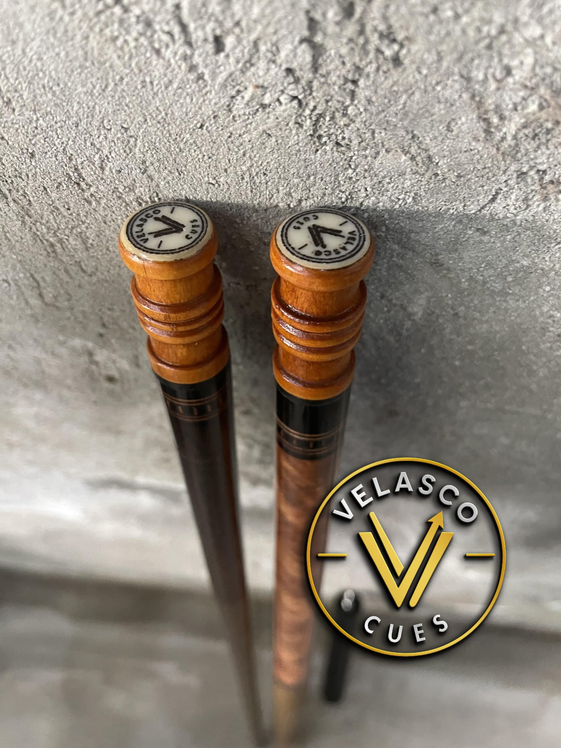 A custom pool cue made from Natural figured burl wood and ebony accents with