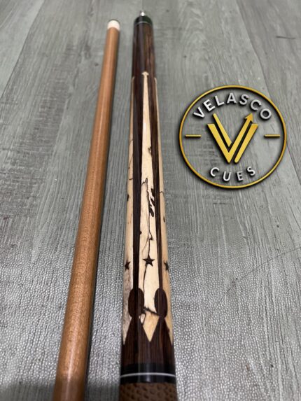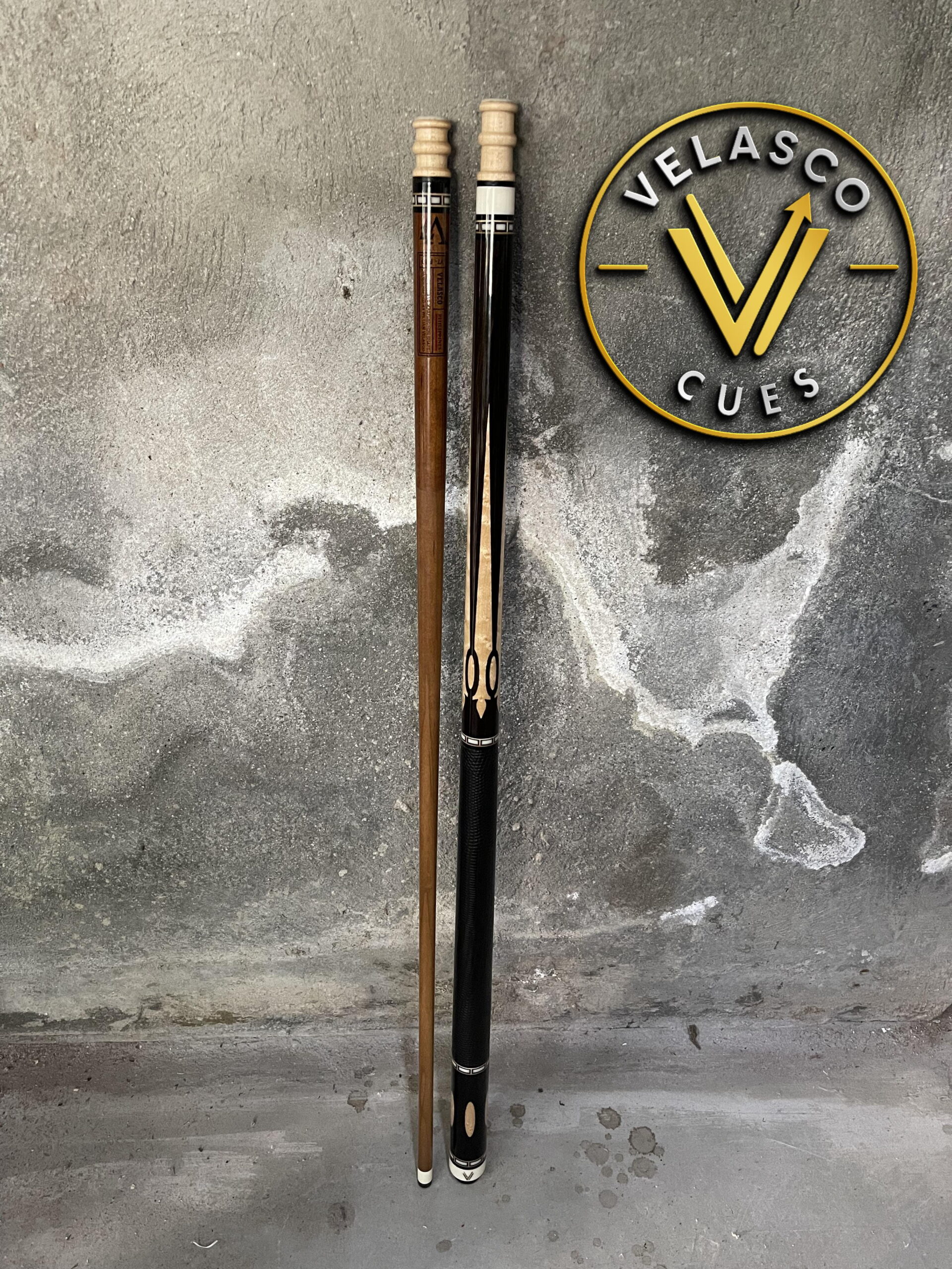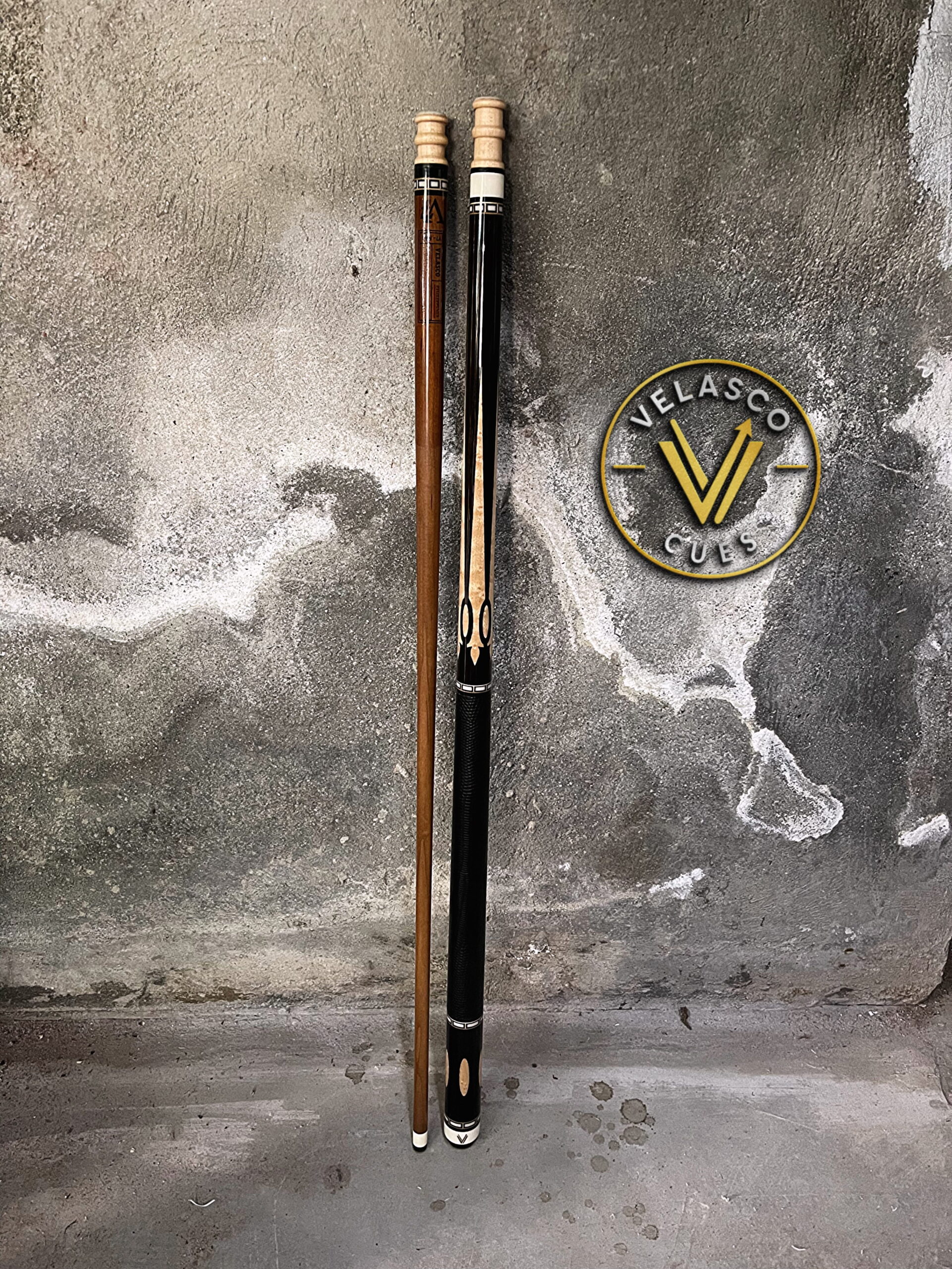 A custom pool cue made from Ebony wood with Birdseye Maple points, featuring