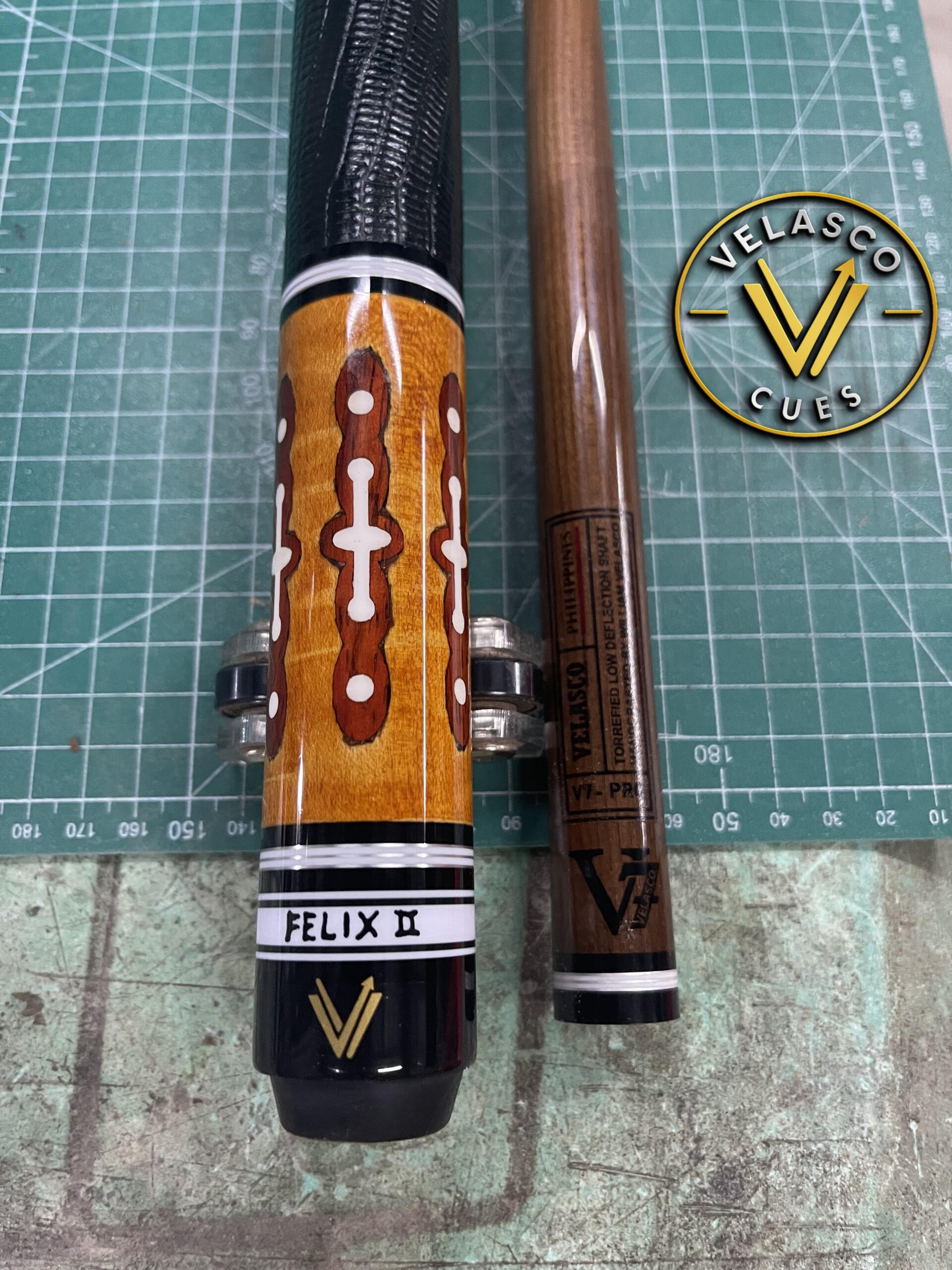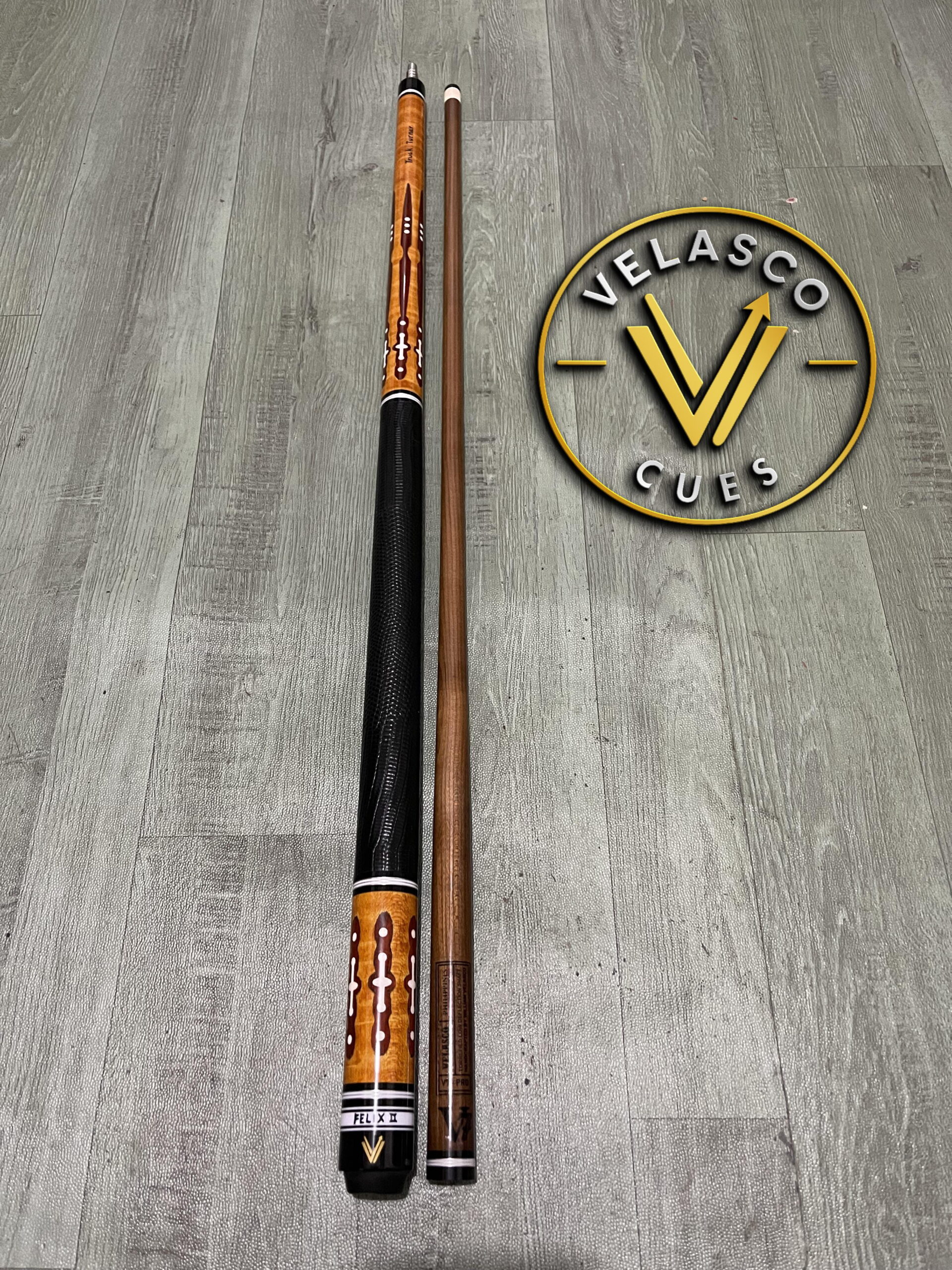 by Velasco Cues. The name “Felix II” is visible on the butt cap of the cue in the image.